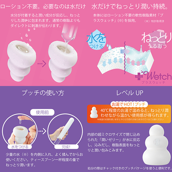 全てが新しくなったプッチ。ポケットサイズのローション不要ホールプッチシリーズが生まれ変わって新登場。軟性素材から内部の構造、パッケージ、全てが新しくなりました。デコボコ感、さらにクッキリ。今回新たに導入した「HD(High Definition)成形」で突起のデコボコ感がさらにクッキリになりました。突起に触れたときの粒立ちが違います。弾力感、さらにモッチリ。「HD 成形」により軟性樹脂の弾力性も向上。さらにモッチモチに、しなやかな素材になりました。内部構造も、さらにハッキリ。オリジナルシリーズ、スイーツシリーズ計8種類の内部構造をより精密な造形にリニューアル。「HD 成形」とあいまってデコボコ感がよりハッキリわかる構造になりました。生産工場を一新。新型プッチシリーズは日本国内に新設した工場から生産。最新の設備と厳密な品質管理で一つ一つ丁寧に作ります。ローション不要、必要なのは水だけ。ローション不要軟性素材「プラスウェッチ」水分が付着すると潤い成分が反応、ねっとりした潤いに包まれます。<ベリー内部構造>「全体を覆う繊細で優しい突起」フワフワとした起毛が包み込みまったりしたなめらかな触感