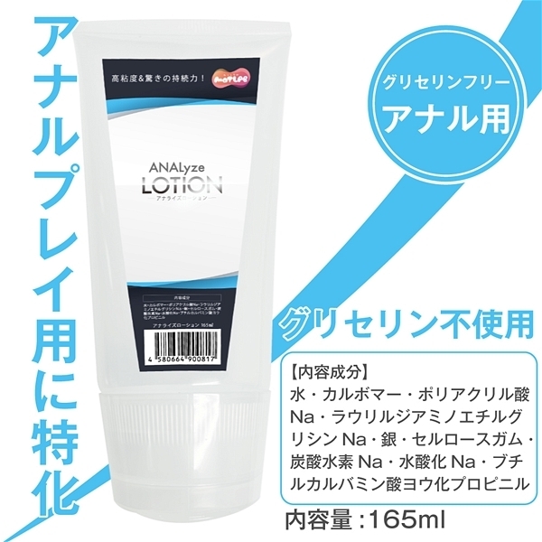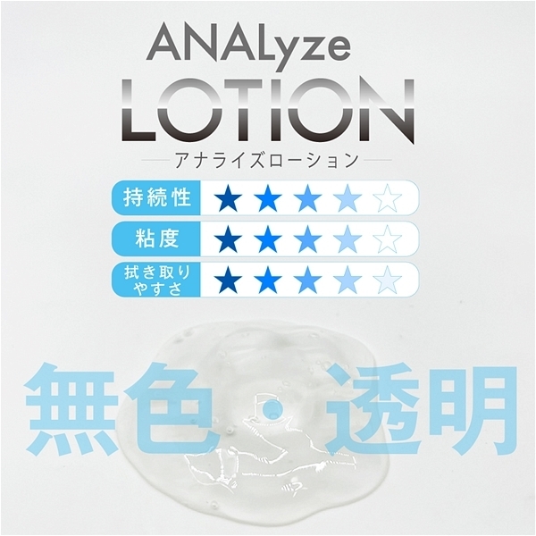 アナルプレイ用に特化した、伸びがよく高潤滑で乾きにくいグリセリンフリーローションデリケートな部分をしっかり守る、アナル専用ローションです。伸びがよく高潤滑なローションなので、大事なデリケート部分もなめらかにサポート。グリセリン不使用でお腹にも優しく、乾きにくいのでロングプレイにも最適です。使用後は水でサラっと流せるので、手間もかかりません。<成分>水、カルボマー、ポリアクリル酸Na、ラウリルジアミノエチルグリシンNa、銀、セルロースガム、炭酸水素Na、水酸化Na、ブチルカルバミン酸ヨウ化プロピニル
