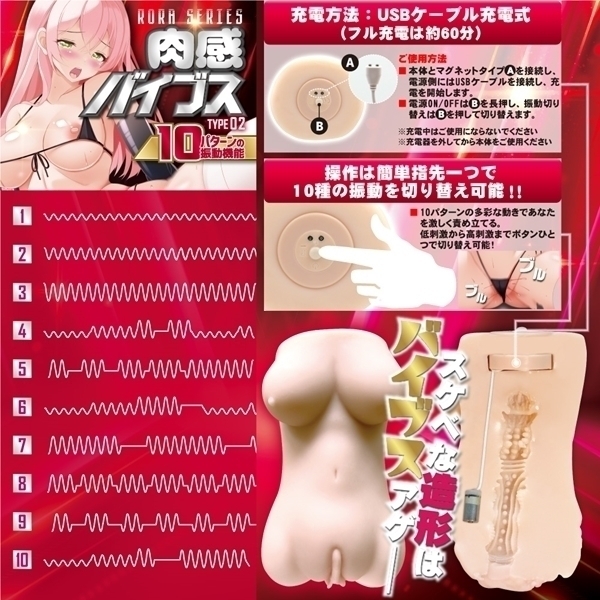 圧倒的肉感と強力ローターのブルブル超振動!多彩な振動パターン搭載のローター内蔵ホール。900gオーバーの肉感にローターを内蔵した大型ホール。TYPE02はナイスバディなトルソー型。入口から走る縦ヒダと大小のイボ・コブが、ローターの振動との相性抜群。10パターンの振動でランダムに蠢き快感をググっと高めます。ローターはUSBケーブルでの充電式。接続部分はマグネット式なので洗浄の際も安心です。見た目も内部構造も振動もすべてに抜かりなしの新感覚ホールです。
