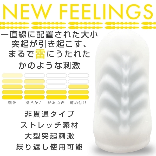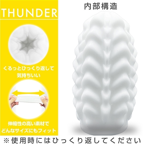 コンパクトでも実用的で繰り返し使えるミニホール。稲妻のような突起が重なる連続刺激構造。コンパクトで持ち歩きに便利なミニホール。THUNDERは一直線に連続した突起がまるで稲妻のように重なり合う刺激を生む波状構造。加えて小さな突起がアクセントになり大突起の存在感を際立たせます。さらに耐久性も高く、繰り返し使用可能。容器はホールを立てられるタイプなので、洗ってからの乾燥や保管にも便利です。