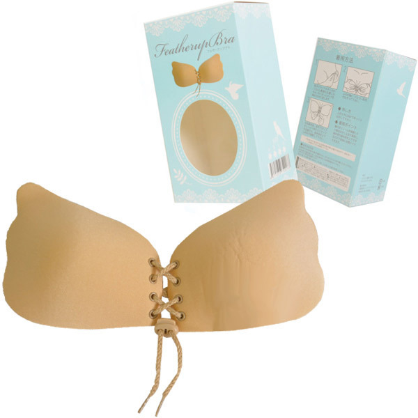 寄せて上げて谷間もメイク♪天使の羽型シリコンブラ「フェザーアップブラ ベージュA」。羽のようなカップがボディに馴染みやすいベージュカラーのモールドブラ!カップ内側は粘着シリコン樹脂、外側はサラリとした肌触りのポリエステル素材です。中央はアジャスターで自在に調整できる編み上げ仕様!胸のボリュームを強調したい場合は少し上目で着用し、紐を持って留め具を上下させるだけで自由に谷間をメイク出来ます。【着用方法】両手でカップを外に向けて反らし、最適な位置にあわせてから外に反ったカップを胸の方向に戻して、ふちが胸につくように指先でなぞって下さい。左右着用後、両手でカップをしっかり押さえて定着させ、留め具をスライドしてお好みで調整して下さい。粘着効果が薄れた際は、一度水洗いし乾燥させてから再度着用して下さい。※サイズは画像を参考にお選びください※通常よりワンサイズ小さめが綺麗に着用できる目安です※Bサイズ(h00035)もございます