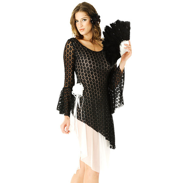 落ち着いた雰囲気の中に、セクシーな大人の女性の魅力を感じるフラメンコのコスチューム。スカート部分がシースルー素材、ドレスは黒のレース使いと優雅さをかもし出しています。扇子とコサージュも付いて3点セットです。