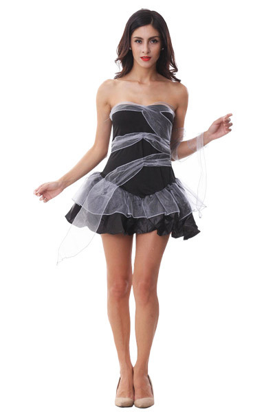 ゾンビメイクでミイラな花嫁に♪ハロウィンにぴったりなゾンビ系ウェディングドレスコスチューム。ダークなブラックカラーのベアトップワンピースに巻いたオーガンジーリボンでミイラの包帯をイメージ!腕にぐるりと巻きつけられるよう、単品リボンもセット。サテン素材のふんわりミニスカートで可愛らしさもしっかり備えたハロウィンコスプレ衣装です。※セット内容以外は付属しておりません。