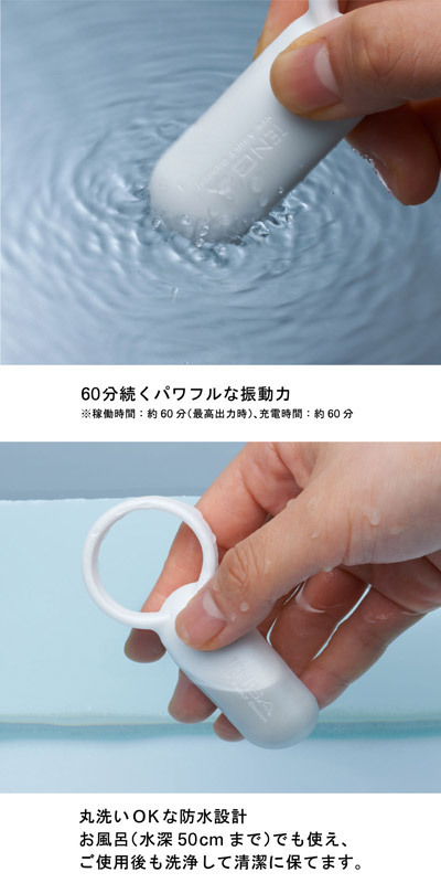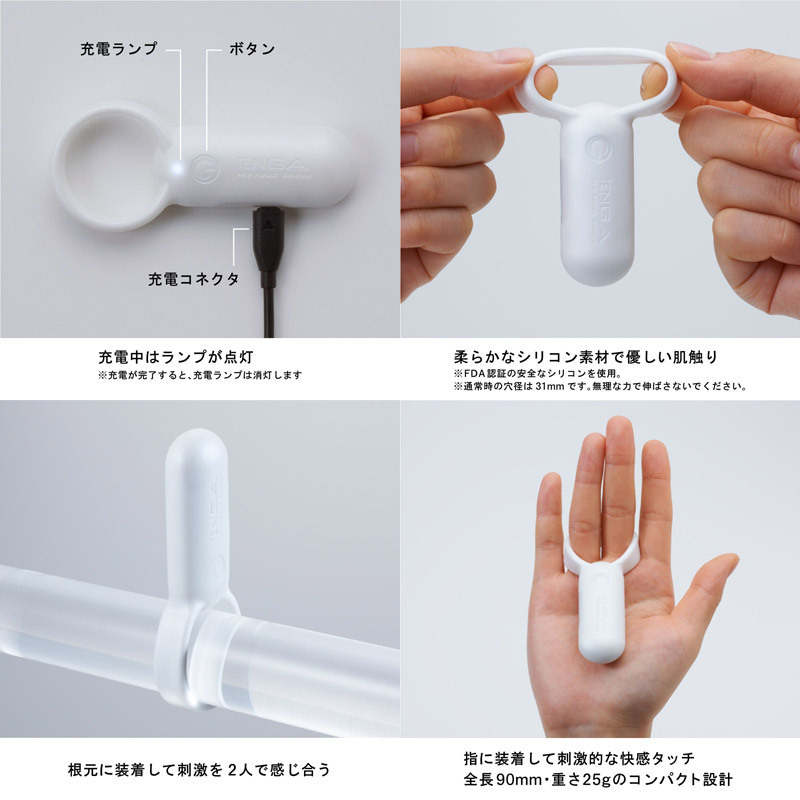 濃密プレイをお約束♪カップルで楽しめるTENGA製ローター。●男性器に通して使用する電動リング●ソフトシリコン製でフィット感抜群●60分のフル充電で60分連続使用可能●強弱×5・リズム×2の合計7種振動●電源ON/OFFはボタン長押し●水深50cmまでOKな防水仕様(USB差込部金属もサビ・感電はありません)。ペニスに装着しても、指に通して愛撫用としても使えるラブグッズ!弱→強の5段階振動と2種のリズムパターンがループするワンタッチ操作も快適プレイの秘密。ローションはウォーターベースタイプのみ併用可能です。※ACアダプタは付属しません。充電には別途パソコン、もしくはUSB端子のついたACアダプタが必要です