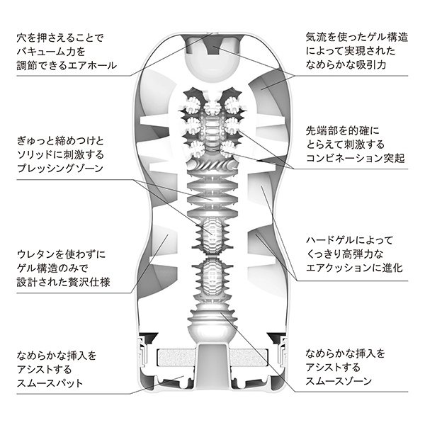 くっきりと刺激する超ハード設計!インナーホールにハードゲルを使用した「TENGA AIR CUSHION CUP HARD」。これまでのテンガシリーズとアウター感は同じですが、内部の中間素材にウレタンを使わず「エアクッション」を採用したことでこれまでにない挿入感を実現しています♪超ハード設計で極上の絡みつき!螺旋状に配置されたゲルの柱構造による独自のエアクッション構造が、ウレタンでは再現不可能な繊細でやさしい弾力を実現♪絡みつくように設計されたディテールとエアクッションによる繊細な弾力!内部構造もハードな構成でヒダ細かく刻まれた突起、カリを撫でるヒダ、最奥の亀頭を撫で回す四方からの突起と尿道へのアタック、これらのギミックが所狭しと待ち構え、バキュームコントロールすることで変化する挿入感と共に射精感を高めてくれています。最高の絡みつきとカップとインナーホールのみのユニークな設計による独特のクッション性!他には無いエアクッションによる繊細な弾力が織りなす極上の快感をぜひお楽しみください♪