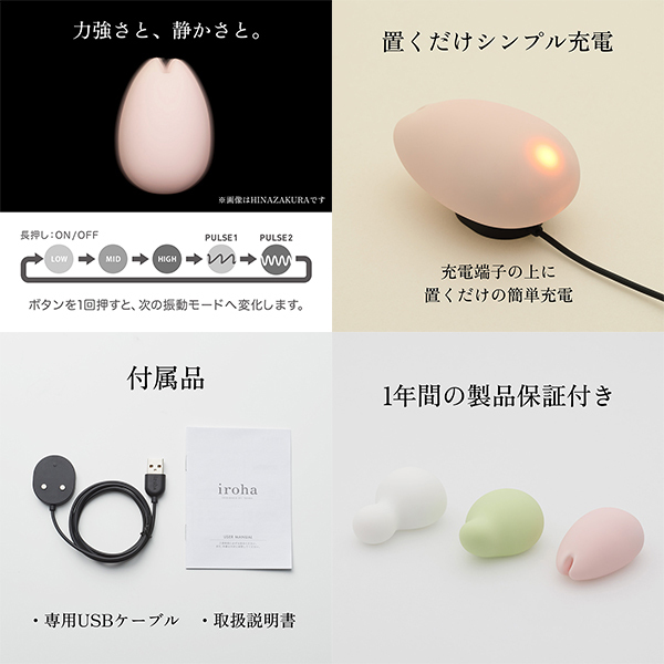 晴れ晴れと、気持ちよく。体へのあたりがやさしい、ふんわりソフトな肌ざわりが好評のセルフプレジャー・アイテムirohaがリニューアル。驚きの静音設計と、シンプルで使いやすい機能設計はそのままに、形状やボタン設計を見直し、リズムパターンを1種類追加しました。今までよりもさらに使いやすくなったirohaは、これからも、すべての女性に気持ちよさを届けます。新しくなったirohaで、晴れやかなセルフプレジャーを、ご体感ください。振動を楽しむのに加えて、2つに割れた先端部で、つまんだりする使い方できます。ひなざくら