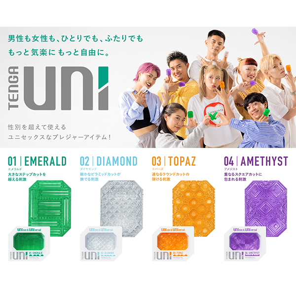 UNIsex&UNIversal。男性も女性も、ひとりでもふたりでも。性別やセクシャリティにとらわれず、誰でも楽しめる次世代プレジャーアイテム「TENGA UNI」。もっと気軽にもっと自由に、プレジャーライフを楽しもう!TENGA UNIは、ぷるぷるのストレッチ素材で作られているので、指にはめて女性器にあてたり、ひっくり返して男性器を包んだり自由な使い方で楽しめます。また、ひとりで楽しむだけでなくパートナーのために使うこともできるユニセックス&ユニバーサル設計のまったく新しいTENGAです。UNI VARIETY PACK4種類のUNIがセットになったバラエティパック!それぞれ異なる刺激を楽しめます。01 EMERALD [エメラルド]:大きなステップカットを越える刺激横向きに連なった大きなステップディテールによって、乗り越えるような刺激を楽しめます。02 DIAMOND [ダイヤモンド]:細かなピラミッドカットが撫でる刺激均等に並んだ細かなピラミッドディテールによって、繊細に撫でるような刺激を楽しめます。03 TOPAZ [トパーズ]:連なるラウンドカットの弾ける刺激全面に連なったラウンドディテールによって、転がり弾けるような刺激を楽しめます。04 AMETHYST [アメジスト]:重なるスクエアカットに包まれる刺激大小が重なったスクエアディテールによって、包まれ吸い付かれる刺激を楽しめます。