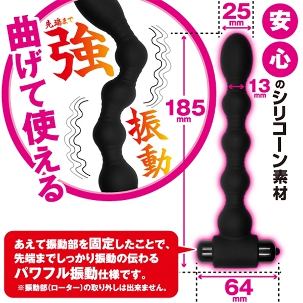 アナル開発初心者にもオススメ!一撃必殺アナル。多彩な10種の振動パターンで先端まで強振動。太すぎず、細すぎず、好みの角度に曲げて使えるのでしっかりフィット! ※振動部(ローター)の取り外しは出来ません、電池交換の際はキャップのみ取り外して交換してください、ローターと本体は固定されています。