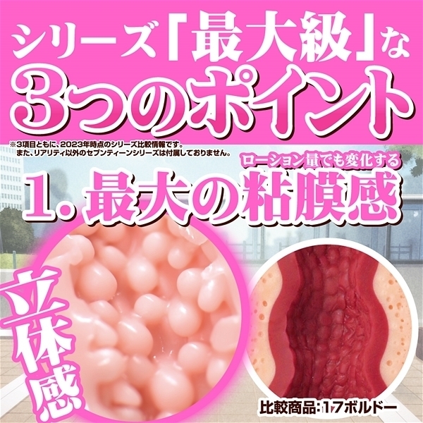 トイズハートが誇る看板シリーズ「セブンティーン」、この集大成として大々的に開発をスタートしたのがセブンティーン リアリティです。改めて二次元と三次元におけるリアルさを追求し、新たなホンモノ体験を具現化することに成功しました。具体的に一番の試行錯誤ポイントは、素材の硬さです。最終的にこの硬度に落ち着いた理由としては、イボ=粘膜感としてのリアルが再現できた為です。絶妙なバランスでイボではなく、まるで粘膜のように感触を感じられ、最終的には満場一致でこの硬度に決定しました。ローション注入量によっても粘膜感が格段に変化することも特徴のひとつです。自分だけの丁度良いローション量を探りながらホンモノ体験を楽しんでいただければ幸いです。