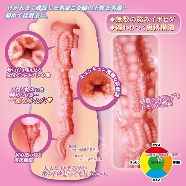 汚れなく成長したお嬢様の名器、初めては貴方に。内側はみっちり低柔軟系素材で外側はしっかり弾力系素材を使用したハイブリッド2層構造。無数に絡みつくイボヒダと纏わりつく奥狭構造。