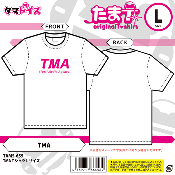 白地にピンクのテキストロゴがポップで可愛い半袖白Tシャツ。胸元に「TMA」の文字をプリントしたタマトイズオリジナルグッズ♪パートナーとお揃いで着てみても◎ゆったりめのLサイズ●メーカー型番:TAMS-655