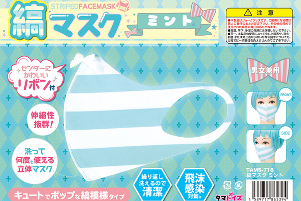 真ん中に可愛いリボンを装飾した白×ミントグリーンの爽やかな縞パン風立体マスク。伸縮性が高くフィット感抜群!洗って繰り返し使えて経済的かつ常に衛生的♪撮影会やイベント時の飛沫感染対策や花粉症予防、ウイルス対策に是非いかがでしょうか?男女兼用●メーカー型番:TAMS-718