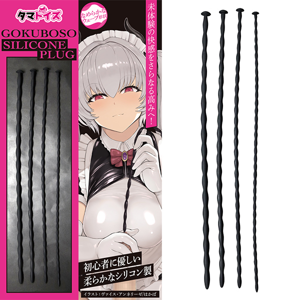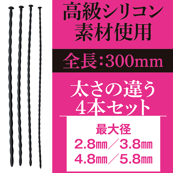 あなたの尿道を覚醒させるシリコン製の「極細シリコンプラグ」!それぞれ太さの違うシリコンカテーテルの4本セット♪長さが十分あるので本格的なサウンディングプレイをお楽しみいただけます!4サイズともにそれぞれ径が違いますが、ビギナーからでも始められそうなサイズ感となっております♪先端部分は先細で挿入しやすく、表面にはデコボコ加工が施され、底部はストッパーになっているので安心感もあります。※サウンディングプレイは衛生面に注意し、しっかりと減菌や消毒を行ってからプレイしましょう。●メーカー型番:TMT-1579