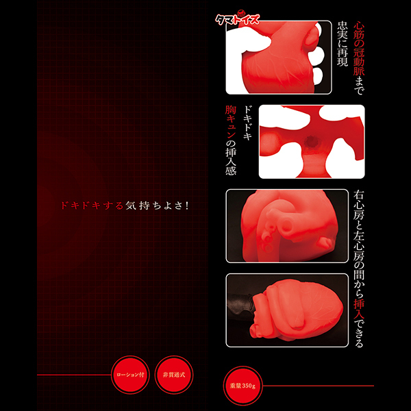 心臓の形を見事に再現した異世界チックな非貫通オナホ「GRASP HEART」です♪脈打つ血管に右心房、左心房までも再現された見た目はインパクト絶大!心筋の冠動脈まで忠実に再現されていて、ドキドキの胸キュンの挿入感は新鮮味バツグン♪挿入は右心房と左心房の間から入れる形でヒダ系が連続する内部構造に興奮必至!グッと身が縮こまった触感やリアルな造形にドキドキすること間違いなし♪ユニーク性とフェティッシュ系の楽しさをぜひお試しください。●メーカー型番:TMT-1626