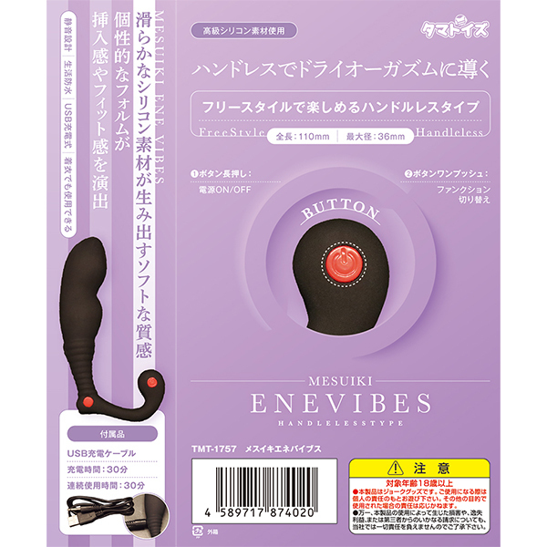 ハンドルレスでドライオーガズムに導く高級シリコン製バイブです♪滑らかなシリコン素材が生み出すソフトな質感と個性的なフォルムが、挿入感やフィット感を演出!充電式ハイパワーモデルで、小型&静音設計♪10パターンの振動があなたを刺激し、モーターの振動が奥までダイレクトに伝わります♪ボタン操作も簡単で、長押しで電源ON/OFF、ワンプッシュでファンクション切り替えが可能!生活防水仕様で、使用後は水洗いが可能です♪USB充電式で、充電時間は30分、連続使用時間も30分!付属のUSB充電ケーブルで簡単に充電できます。サイズは全長110mm、最大径36mmで、コンパクトながらも効果的な前立腺刺激を提供します♪前立腺を圧迫する挿入シャフトの絶妙な太さと、内蔵する振動モーターによる多彩な振動!さらに会陰を圧迫して外側からもレスポンスよく前立腺を刺激します♪このドライオーガズム誘発アナルバイブは、普段ハンドルありを使っている方には全く新しい体験を提供します!●メーカー型番:TMT-1757