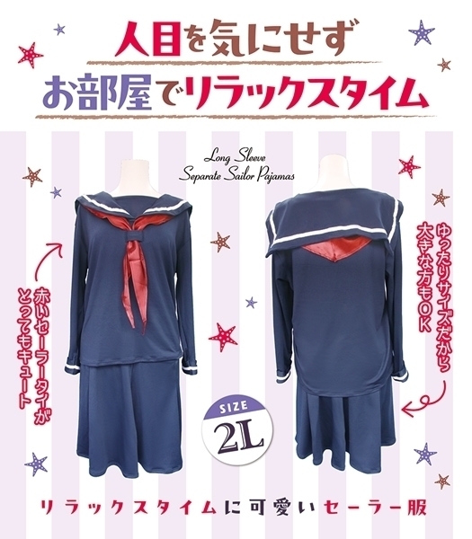 おとこの娘専用の可愛いセーラーパジャマが登場♪ゆったり2Lサイズで大きめの方でも安心!裏起毛のカットソー素材でふんわり暖かい着心地♪リアルなセーラー服みたいなセパレートタイプ!お部屋でリラックスタイムを可愛く演出♪赤いセーラータイがポイントのキュートなデザイン!胴回りもゆったり仕様でストレスなく着られます♪ポリエステル95%で肌触りも柔らかく快適!のんびり過ごすお家時間がもっと楽しくなりますよ♪●TAMS-1250