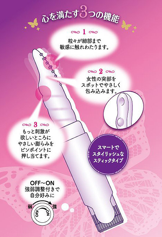 化粧品のような見た目のスタイリッシュなキャップ付きスティックローター。●スマートなスティックタイプ●先端は弾力のある心地よい柔らかさのシリコン素材●底部をひねるだけで電源ON/OFFから強弱振動まで操作可能。先端の内側に付いたくぼみでクリを包みながら刺激したり、背面に付いた無数のツブツブで刺激にアクセントを加えたりと楽しみ方は自由!鞄やポーチに忍ばせておけば、いつでもあなたの心を満たしてくれる癒しアイテムです。