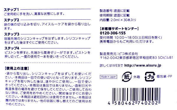まとめ買いにも便利な業務用30本入り!潤い不足で悩む女性の為の潤滑ローション「アイスルーケア」。●ワンタッチで注入できる注射器タイプ●一回使い切りの個包装で衛生的●自然に潤う無香料・無着色●身体にやさしい成分を配合した弱酸性。注射器型のプラスチック容器だから、手を汚さず注入出来てとっても衛生的!口に入っても大丈夫な無味無臭なので、安心してお使い頂ける日本製の潤滑ゼリーです。