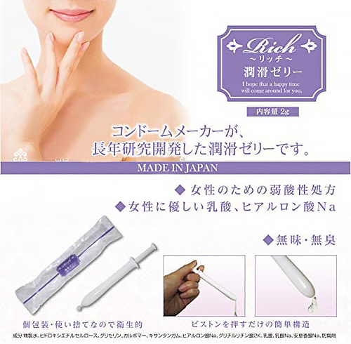 コンドームメーカーが長年研究開発した潤滑ゼリーです。潤い不足で悩む女性のために作った弱酸性処方で女性に優しい乳酸ヒアルロン酸Na。●急性毒性試験済みなので安心してお使いいただけます●無色透明・無味無臭の潤滑ゼリー●注射器型だからワンタッチで手を汚さず衛生的●ピストンを押すだけの簡単構造●個包装・使い捨てなので衛生的。120本入り