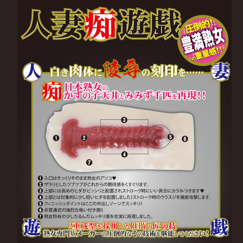 名器の証、かずのこ天井とミミズ千匹を再現!むっちりと豊満な熟女のアソコを堪能できるオナホール。●RUBYオリジナル素材「BBA」を使用した2層成型●優しく迎え入れてくれる大きなビラビラの入口●かずのこ天井+ミミズ千匹の極上構造●上部に長め、下部に短めのヒダを配置。熟女専門AVメーカーならではの匠の技!強烈な吸い付きと共に絡みつく快感構造の熟女オナホールです。