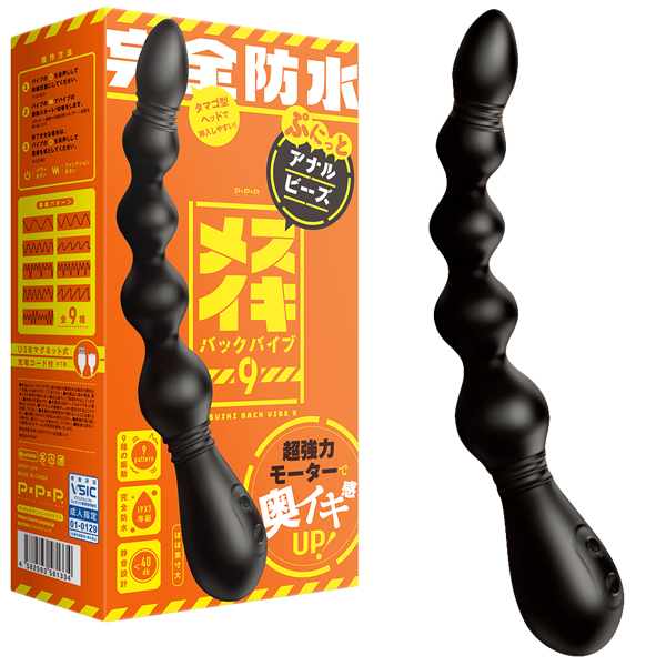 超強力モーターで奥まで響く!5連球の凸凹刺激&9種類振動が絶頂へ導くIPX7等級の完全防水アナル用のメスイキバックバイブ。卵型ヘッドの滑らかな挿入感と、ボディの弾力が生み出す心地よい密着感♪全長23cm、肌への負担が少ない柔軟素材仕様で、球の大きさは2.1cm〜最大3.7cmと