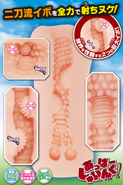 二刀流イボを全力で射ちヌケ!あっぱーしゅいんぐ!(Upper手淫具)は、ロングセラー商品「ふるしゅいんぐ!(FULL手淫具)」の続編となる、全長165mm、重量370gのミドルオナホールです(2way式非貫通)。中間部に配置された2つの巨大ヒダイボ(二刀流イボ)が最大の特徴で、狭道内に交互で連なり上下から圧迫する高刺激構造となっています。その二刀流イボとの快感アクセントとして「中イボ、横ヒダ」を内部に全面配置。最奥の「2つのフィニッシュポイント」を隔てる「鋭角タテヒダ」のエッジも加わり、全体を通して緩急のある多様な刺激をお楽しみいただけるオナホールとなっています。※保管に便利な専用ブリスターケース、専用ミニローションが付属。