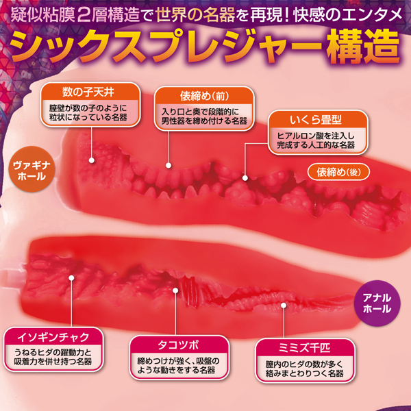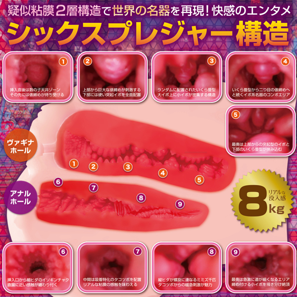 成人女性のまんま実物大サイズの臨場感溢れるリアルなフォルム!世界の名器を完全網羅したシックスプレジャー構造の大型非貫通オナホールです。大きさは「成人女性の実物大サイズ」でスリーサイズの「ヒップ85cm相当」のリアルボリューム。臭い控えめサラサラ触感の「人肌素材」を使用していますので、股間やヒップに顔をうずめる〜などのフェチプレイもお楽しみいただけます。