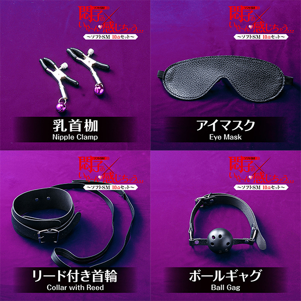 手にしてすぐに使える人気SMプレイの10点セット「悶子のいやぁーん感じちゃう」!このセットさえあれば、目隠しから拘束プレイにスパンキング、緊縛プレイにクリップ責めなどソフトなSMプレイが存分に楽しめます♪初心者でも手軽にSMが楽しめる!口の動きを遮るボールギャグやペット気分で楽しむリード付き首輪、バラムチにリード付き首輪、焦らしプレイが楽しめるフェザーにロープなど多彩なプレイができるアイテムを同梱!初めてSMプレイを楽しみたいカップルの方には特におすすめです。本体:アイマスク(8.0×19.0cm)、ボールギャグ(最大長63.0×幅2.0cm・ボール径4.5cm)、リード付き首輪(最大長51.5×幅5.5cm・リード長95.0cm・チェーン長10.0cm)・乳首枷(3.0×7.0cm×2個)、手枷(最大長32.0×幅5.0cm・チェーン長10.0cm)、足枷(最大長37.0×幅5.0cm・チェーン長10.0cm)、手枷足枷十字連結(31.0×31.0cm)、バラムチ(全長62.0cm)、フェザー(全長27.0cm)、ロープ(全長55.0cm・太さ0.8cm)
