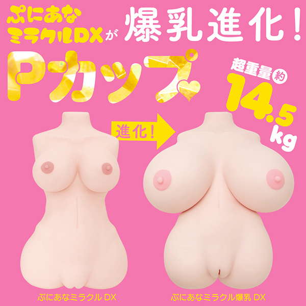 爆乳がここまで進化した!「ぷにあなミラクル爆乳DX」♪これでもかと言わんばかりにおっぱいが大きくなっちゃった!超重量約14.5kgの巨大トルソー型ダイナマイトボディに高弾力骨格シリコン内蔵♪安定感抜群の爆乳クビレ巨尻!リアルな抱き心地を完全再現してのお披露目です。内部層にも随所にこだわりが見られ、とろとろ内層にぷりぷり外層の2層構造で揉み心地にもこだわった極上おっぱいは耐久性抜群!夢の爆乳パイズリで幸福感も絶好調♪ずっと弄っていたくなる少し硬めの素材で成型されたコリコリ乳首は触りすぎ注意ですぞ!密度MAXなイボ天国に超絶リアルな無次元お尻で2つの穴をハメ比べ♪おっぱいの形状を保持するためのおっぱい固定バンド付き。ボディサイズ:B100cm(Pカップ)、W51cm、H72cm、全長50cm。※大型商品の為、送料が別途必要になります。