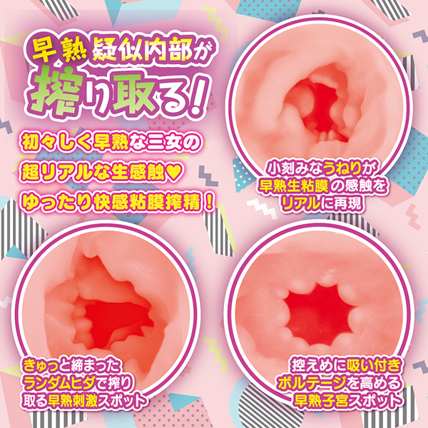 それぞれ個性的なアソコを持った姉妹!花城家巨乳三姉妹の三女花城苺は生感触を追求した粘膜刺激が特徴のリアル系生粘膜の非貫通オナホです。早熟疑似内部が搾り取る!密着系素材のボディは嫌なベタつきや臭いを極力カットした使いやすい素材を採用。ストロークしやすいジャストグリップ構造でサイドにハンドグリップが施され、握力を伝導しやすいフォルムとなっているため、しっかり刺激を感じることができる250グラムのオナホです♪内部構造は生感触を追求した早熟疑似生粘膜構造!きゅっと締まる早熟な内部は不規則な粘膜ヒダが包み込む本物の仕上がりになっております。長期保管に便利な専用ブリスターケース付き、オリジナルローション付属。