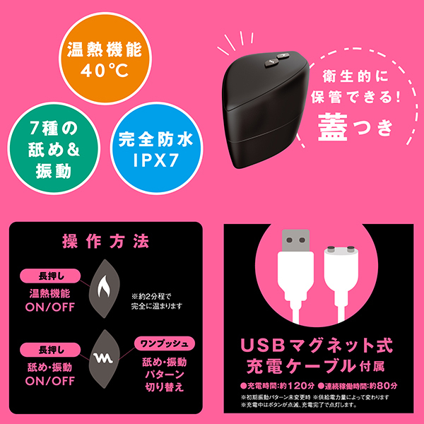 アツくて甘〜い愛のご奉仕クンニ_超!愛を感じる舐めローター!彼の熱い舌を思い出す温感機能は40℃まで温まる人肌温度_先っぽで刺激するチロチロクンニからグイグイ舐め上げる激しいクンニまで多彩なクンニが楽しめちゃう_さらに7パターンの振動機能付き!震えるあったかベロでとろける濃密前戯_やっぱりクンニがナンバー1!!!完全防水なので使用後のお手入れもラクチン♪敏感な部分に直接使うものだから、優しい肌あたりの高品質ソフトシリコンを使用しました。衛生的に保管できる蓋付きです。振動・舌舐め:7パターン&完全防水IPX7等級&充電用USBケーブル付属。カラー:ブラック