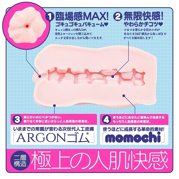 限りなく本物の肌と質感を追求した次世代人工皮膚素材を使用!いままでの常識が変わる次世代人工皮膚素材「ARGON(アルゴン)」を使用した非貫通オナホ「次世代HOLE XYZ 人工皮膚」です♪計算された内部構造にローションと空気の黄金比!極上の「ギュポギュポ」する吸い付きと挿れ心地は絶品です♪外層は柔らかいのにベタつかないさらっとした人肌再現の新素材を使用!内層は使うほどに成長する革命的素材「momochi」を使用することで、使えば使うほどにあなたに馴染んで成長するもっちり人肌感覚がたまりません♪劣化しずらい高い耐久性や弾力性も魅力的!2層構造が極上の人肌快感とキュッと締まった挿入口、そしてストロークの度にエッチなギュポ音を発する使用感が聴覚からもイキを誘発してくれそうです♪素材は安心の国産素材&国内生産。パッケージイラストは人気絵師「ぴょん吉」氏を起用。