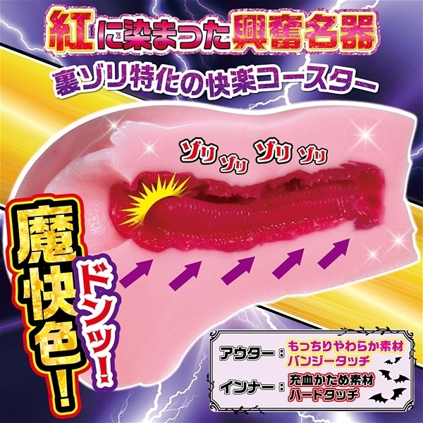紅に染まった興奮名器。裏ゾリ特化の快楽デビルコースター。インナーのハード素材をアウターの柔らかさでバランスよく締め付け圧を逃がす魔快色充血二層式。流れるように紅のゾリゾリレールに滑り乗る。アッパーゾリ上げ快感に痺れる足ピン昇天絶叫。充血した荒い上肌とマグマレーンゾリ上げに挟まれ走りだす快楽コースターで足ピン快楽必須です。