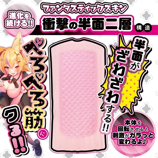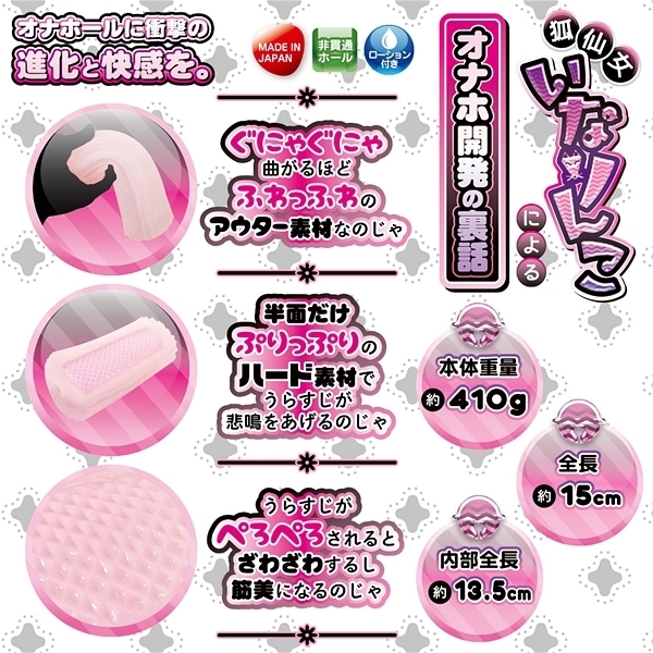 狐仙女による新たな刺客が届いた!!それが「半面二層!!ざわペロ筋美」である。いなりんこは妖術と神力を使い分ける稀有な狐仙女の次女。スケベな事が大好きで男性向け性的竹輪を研究する。今回いなりんこは「ざわペロ」というコンセプトを得て新たな境地に達する。ふわっふわのアウター素材で優しく柔かく包み込まれるのは最近の定番。夢心地の気分から突然の刺激が襲ってくる二段構え!!このギャップがスゴイ!!なんと!!うら〇じが悲鳴をあげるほどの「ざわざわ」であり「じょりじょり」であり、しかし「ペロペロ」でもあるのだ。それもそのはず。「半面二層」というオリジナルギミックで、特にうら〇じを執拗に攻める仕様になっているのである。果たして人間にこの摩訶不思議かつ強烈な使用感が理解できるのか…?「そのうら〇じ、ざわざわペロペロさせてもらうのじゃ!」