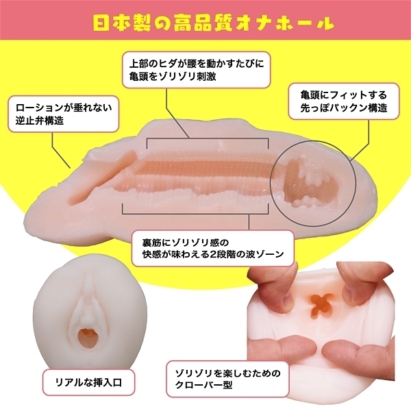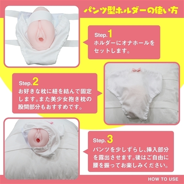 腰振りオナニーができる!!付属のパンツ型ホルダーでお好きな抱き枕やまくらにオナホールを固定して正常位みたいに腰振ってお楽しみいただけます。オナホール本体も腰振りオナニーに合わせてキツ過ぎず緩過ぎず、ある程度腰振りを楽しんだら好きなタイミングで射●できるような設計になっています。逆止弁構造でローションが漏れにくいので枕を汚す心配もなく安心して腰を振れます。オナホール重量:200g