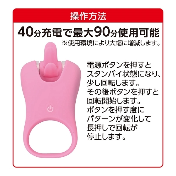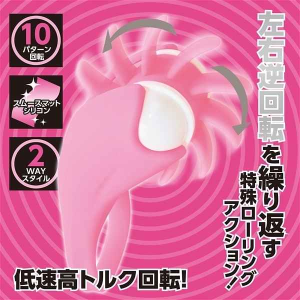 左右逆回転を繰り返す特殊ローリングアクション機能のリング登場。よりリアルな低速回転アクションをハイパワーモーターで実現。指にはめたり、リングとして着用してク○や乳首を刺激!リバース回転を繰り返す動きを含む10パターンアクション。リチウムイオン電池搭載で90分で満充電・最大40分使用可能(使用環境により大幅に増減します)。生活防水性能。リング部は肌触りの良いシリコン素材採用●カラー:ピンク