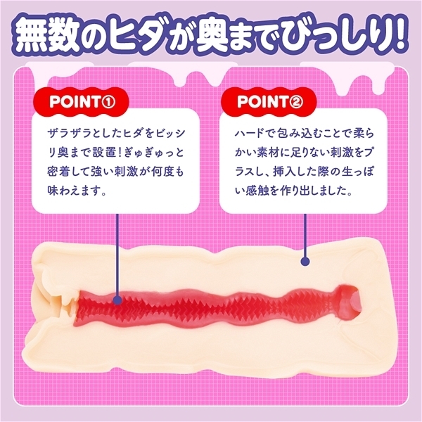 手からこぼれ落ちるほどのウルトラソフト素材をハードで包んじゃいました。挿入した際の生っぽい感触を再現しながらハードで包み込むことで足りない刺激をプラス。極端に硬さの違う素材によってまるで生きているかのような、うごめく感触をお楽しみください。