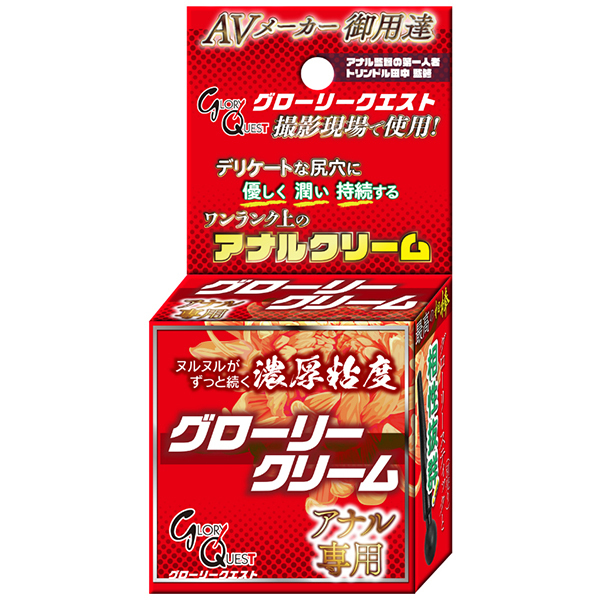 グローリークエストの撮影で実際に使用!デリケートな穴に優しく、潤う。快適なア〇ルプレイを楽しんでいただける『ア〇ル専用』クリームです。グリセリン未配合なのでおなかが緩くなったりせず、低刺激なものとなっており敏感な部分に負担をかけません。パートナーとのア〇ルプレイにもア〇ルグッズ使用時にも、プレイ前に使用していただくと適度にほぐれ、快適なア〇ルプレイを楽しんでいただける『ア〇ル専用』クリームです。
