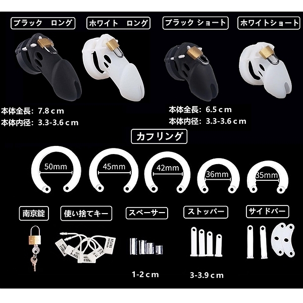 各部品を組み立てることで、あらゆるサイズに適した貞操帯が出来ます。先端に排泄口があるので装着中も排尿が出来ます。南京錠をすることで射●管理を確実に行うことが出来ます。ロング・ホワイト