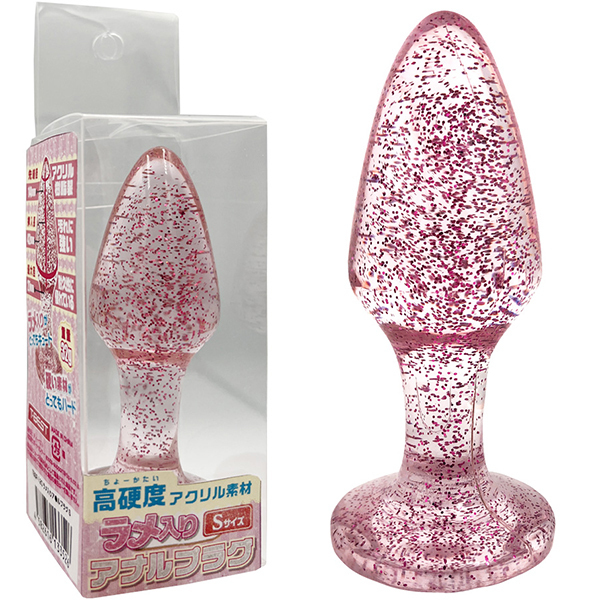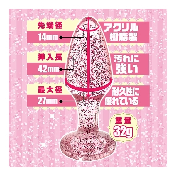 ラメ入りがとってもキュートなキラキラ系アダルトグッズ、「ラメ入りア●ルプラグ」!気分はまるでパーティー♪透明ボディの中には、キラキラのラメがみっちり入りました。眺めているだけで楽しくなる可愛いアイテムです。本体素材には、魅力を高めるアクリル樹脂を使用しました。アクリル樹脂はガラスのような透明さをもちながらも優れた耐衝撃性で割れにくいのが特徴です。耐水性もあるので水や汚れに強くメンテンナスの簡単さもポイント。さらにはカチカチの高硬度タイプ。柔らかいア●ルプラグには無い自己主張の激しい刺激にきっと魅了されるはず。キュートな見た目とは裏腹にハードなア●ルプレイをお楽しみください。「Sサイズ」は、全長82ミリに太さ27ミリのミニサイズ。ビギナーの方や、低刺激で快感に慣れたい方などにオススメです。