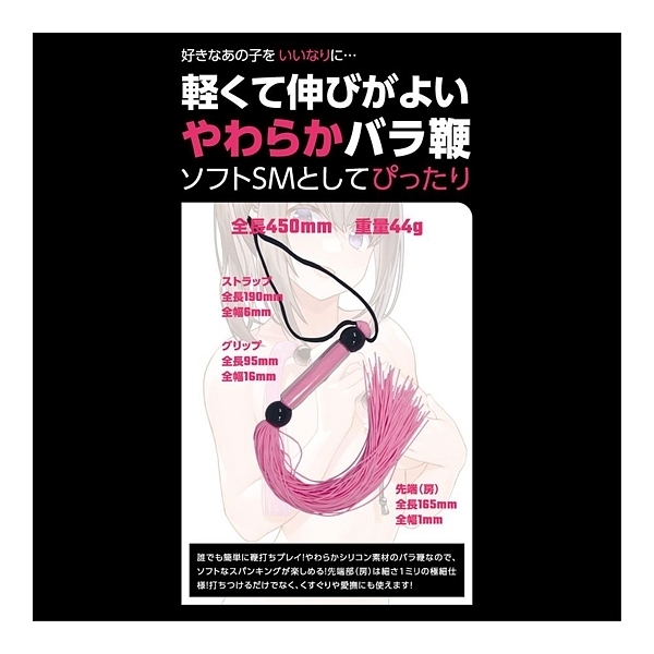 好きなあの子をいいなりに…。SMプレイの代名詞、SM専用バラ鞭「SMシリコンバラ鞭」!ビシッバシッと叩く音が響き渡る、SMプレイでは欠かせない「鞭責め」をお手軽に始められるSMアイテムです。細さ1ミリの柔らかいシリコン素材を束ねた鞭ですので、重さも軽く、初心者の方でも簡単に取り回しできます!柔らかさがクッションとなり痛みになりづらくバラけた鞭先からは大きい音が鳴り鞭責めの興奮を強く煽るはず。シリコン特有のサラリとした肌触りなので不快感もありません。全長260ミリ(ストラップ含まず)とやや小ぶりサイズなので、軽い気持ちで手に取れまず。遊びのつもりでビシバシしていると、いつの間にか鞭責めの魅力に惹かれてしまうかも!●カラー:ピンク