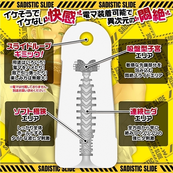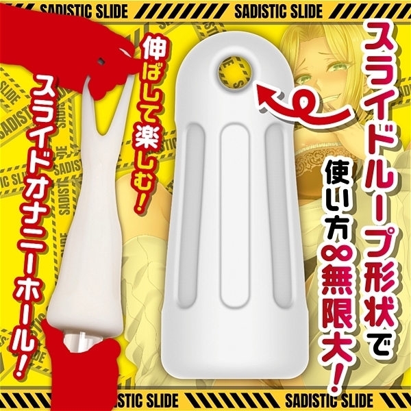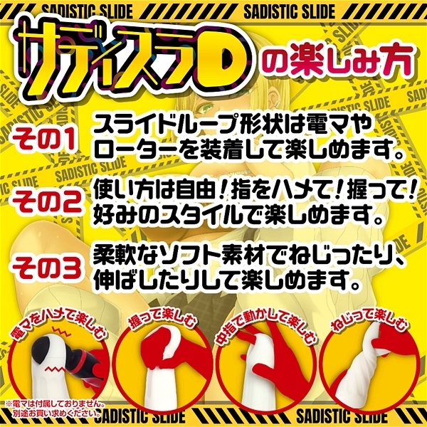 先端を刺激するギミックホール「サディスラD」は伸ばして楽しむスライドオナニーが楽しめるオナホールです。電マやローターを装着できるオナホールが欲しい!オナホールを伸ばして刺激したい。という新しい想像から「サディスラD」は開発されました。上部に空いている「スライドループギミック」は電マやローターをハメたり、引っ張ったり、握ったり、ねじったりと、いろいろな楽しみ方で遊べます。「電マ」「大型ローター」を装着することにより、他では味わえない「先端を直撃する強力な振動」で「イケそうでイケない状態」【悶絶】を味わえます。根本をおさえて伸ばして楽しむ「スライドオナニー」やねじって楽しむ「スクリューオナニー」などオナホール本体の「形状変化」に取り組んだ「新しいスライドオナニー」をお楽しみください。非貫通オナホール、ソフト素材使用。保管に便利なブリスターケース付き、専用ローション付き。※電マ、ローター等は付属しておりません、別途お買い求めください。