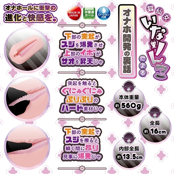 狐仙女による新たな刺客が届いた!!それが「スジ爆発!裏なめ子」である。いなりんこは妖術と神力を使い分ける稀有な狐仙女の次女。スケベな事が大好きで男性向け性的竹輪を研究する。今回いなりんこは「スジ爆発」というコンセプトを得て新たな境地に達する。ふわふわ続きだったアウターに、ほんの少しのプリプリ感をミックス。柔らかいだけじゃなくリアルな締まりを再現する事に成功。ヒダとイボの鉄板構造で既に満足度は120%を超える。そこにスジが爆発するほどの突起を配置したら…もちろんスジ爆発の完成だ。ハード素材で確かな存在感を放つ、恐るべきスジ攻め突起を感じてほしい。もうダメと言っても無理やりイカせるほど、それは強烈な快感がおそってくるだろう。「スジもサオも快感も全力で爆発じゃ!」