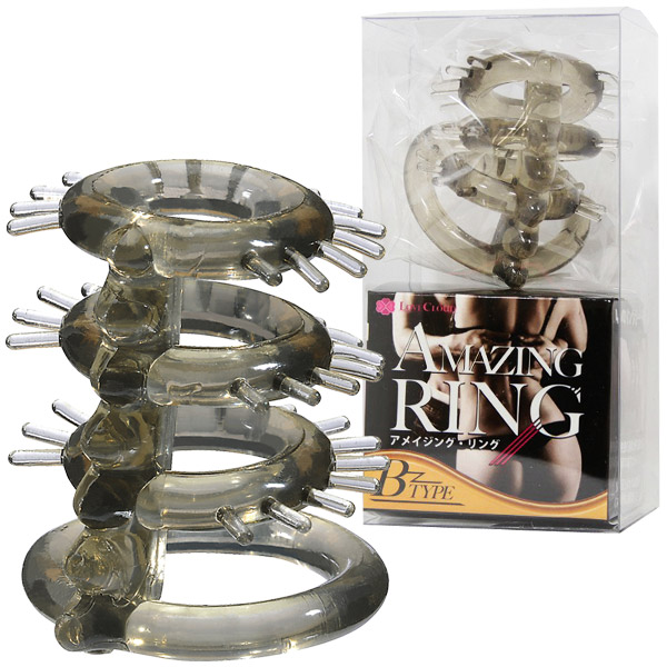 新しい刺激と快感に出会える!男根をしっかりと締め付け、持久力アップを強力にサポートする4連リング仕様の男性補助グッズ。タイプBは上部3つのリングに付いたトゲが、くすぐるように刺激を与える特殊形状!さらに連結部分の波形状が相手の敏感なところを責め立てます。また、リングを玉袋に通すか通さないかで体感する刺激が変化!いつもと違う快感と持続力で、貴方の日常を変えるペニスリングです。