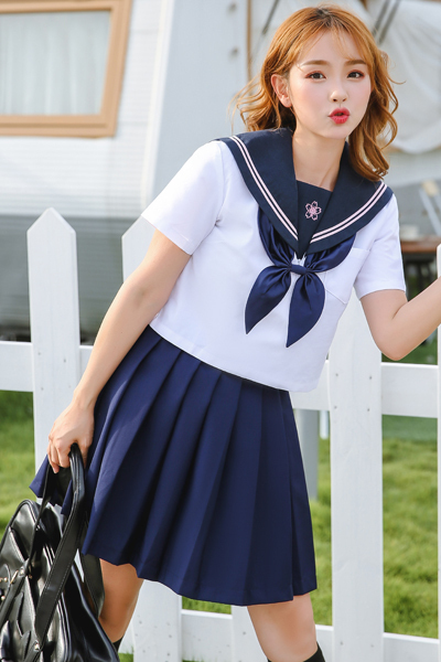 桜モチーフの校章が本格的♪紺×白のミニ丈半袖セーラー服コスプレ。清純な白ブラウスにネイビーカラーのプリーツスカートを合わせた定番デザインで、襟には2本の白ライン入り、フロント布には愛らしいピンクの桜が咲き誇る♪初々しさと清潔感を感じさせる可愛いセーラー服です。※こちらの商品は受注発注商品の為、ご注文から発送までに1〜2週間掛かる場合が御座います。