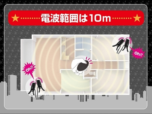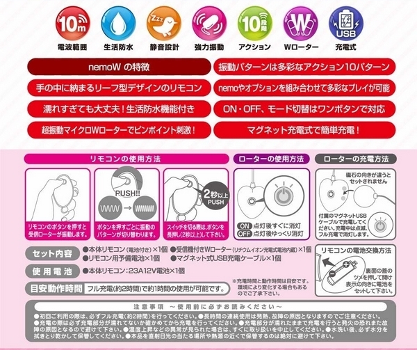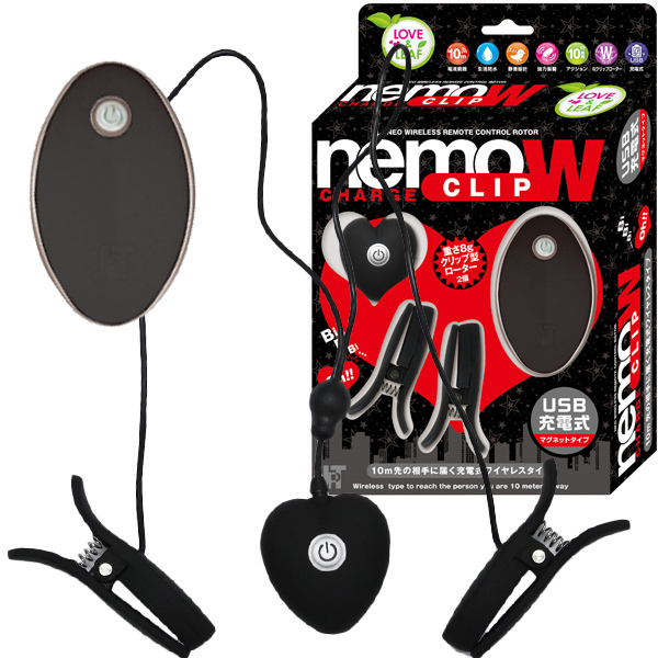 ダークなブラックカラーのワイヤレスクリップ型ローターです♪生活防水加工が施されたマット仕様なクリップ型ローターはサラッとした肌触りで、重さは約8gと着けていても疲れにくいほどの重量。挟み心地は痛すぎず、しかし脱落しづらい力加減で、ローターの震動をしっかり感じていただけます♪震動アクションは豊富な10種類!乳首やクリなど、お好みの箇所に挟んでお楽しみください♪また、遠隔操作にも対応で、送受信距離はおよそ10m。屋外での野外プレイにも最適です!1人はもちろん、パートナーさんとのプレイにもぜひお使いください♪本体はUSB充電式で、約2時間の充電により1時間ほどの連続稼動が可能となっております。リモコンは23A12V電池×一本を使用(別途予備電池が1本付属)!本体付属の電池、予備電池は動作確認用のため、お早めの交換をお願いします。ローターは電波を受信するたびに電池を消費してしまうため、使用後は必ず電源をオフにして保管してください!使用する際はリモコン用電池の絶縁体を外してからお使いください。